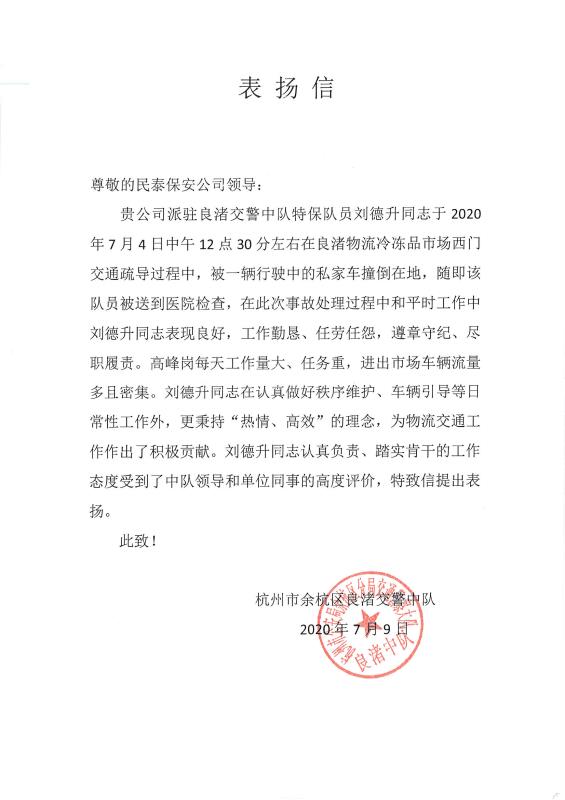 7月27日,浙江民泰保安服务有限公司收到一封杭州余杭区良渚交警中队的表扬信,对员工刘德升的工作给予了充分肯定和赞扬。