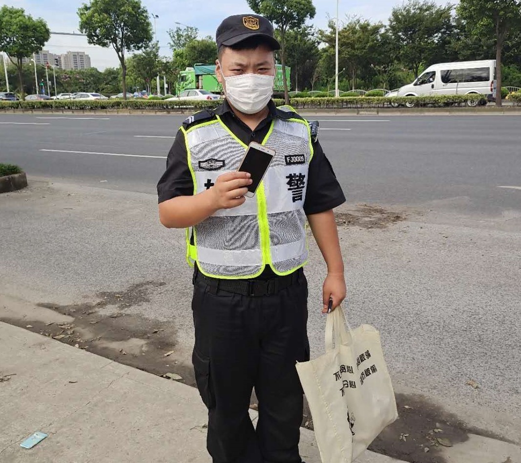 8月7日7时左右,周浦市容辅警项目队员马跨越、吕振涛在申江南路周祝公路配合民警进行交通整治时,捡到一部没有设密码崭新的华为手机,第一时间汇报项目。
