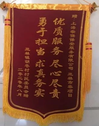 事后,甲方领导和三林镇胡巷村村民委员会主任胡建忠,赠送锦旗给予单野与倪长江,对宗保公司员工过硬的素质修养给予充分肯定和赞扬。