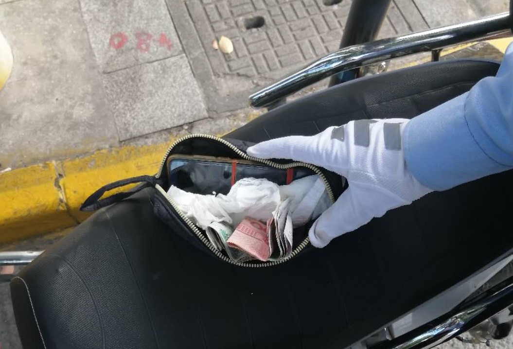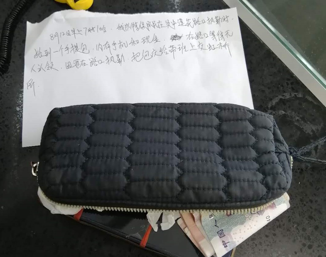 8月12日7:10,宗保公司驻闵行交通辅警项目队员范成刚,在吴中路莲花路路口执勤时捡到一个手包,包内有手机、现金等物品。