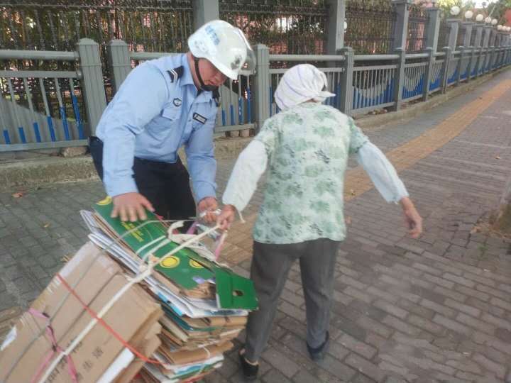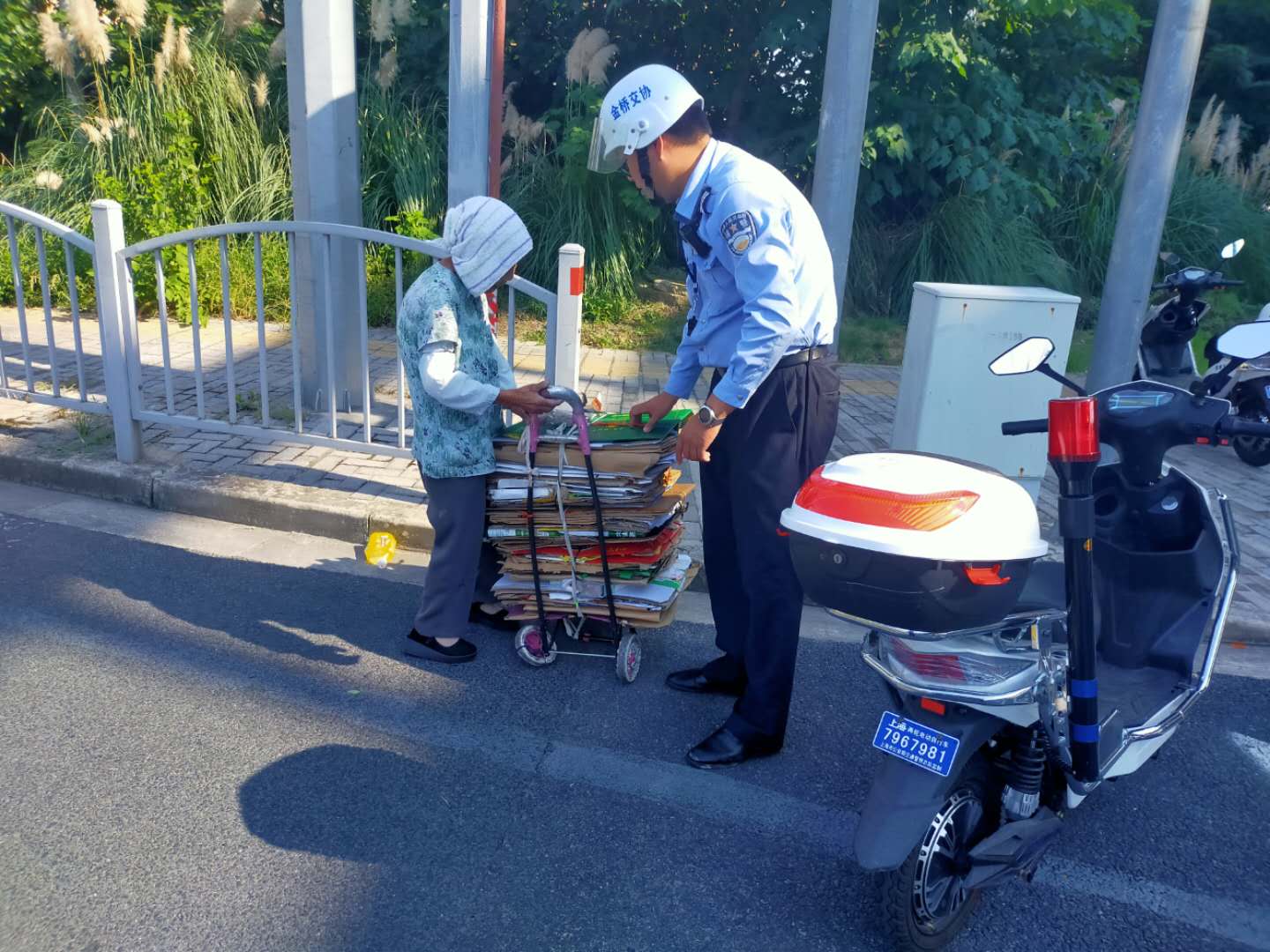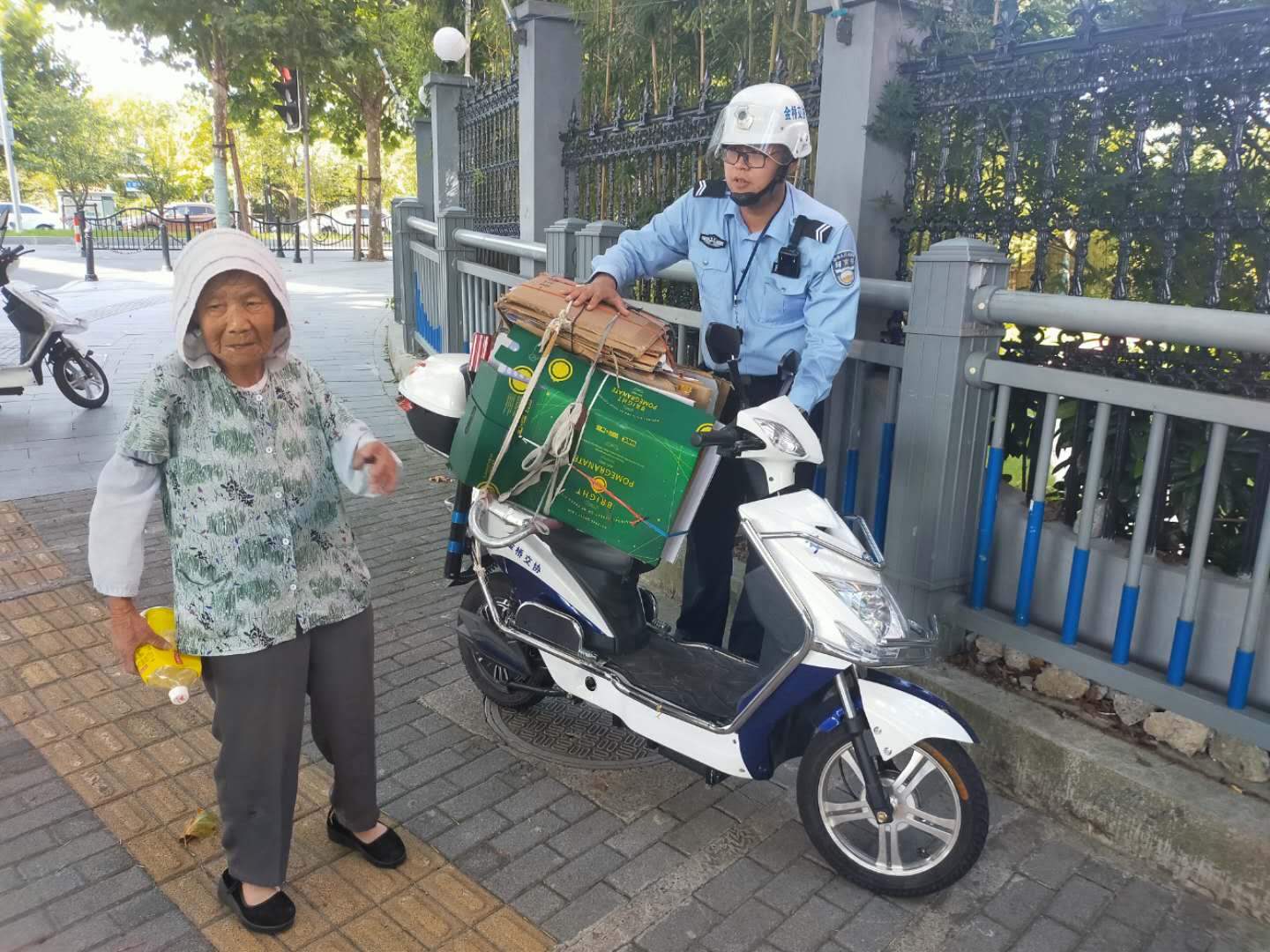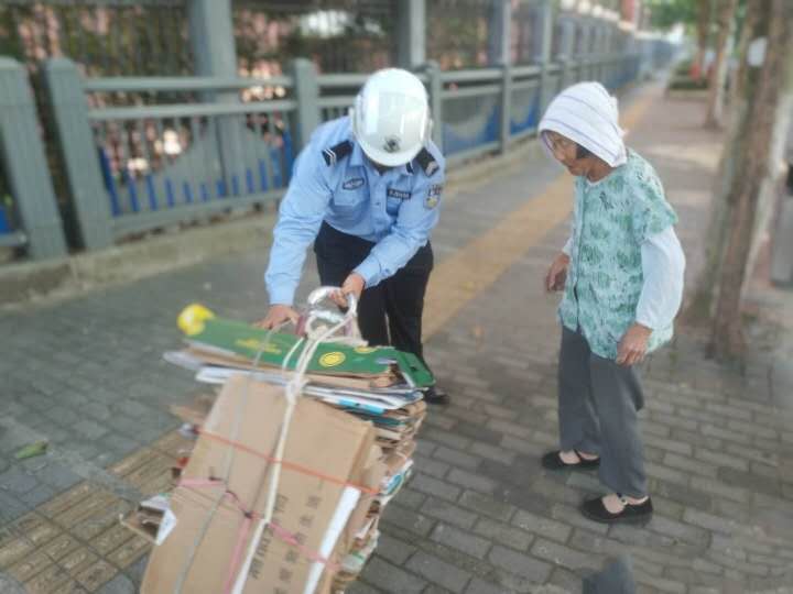 9月6日,金桥交通管理辅警张淋与王乾宇,帮助一位拾荒老人,并将她安全送到目的地。