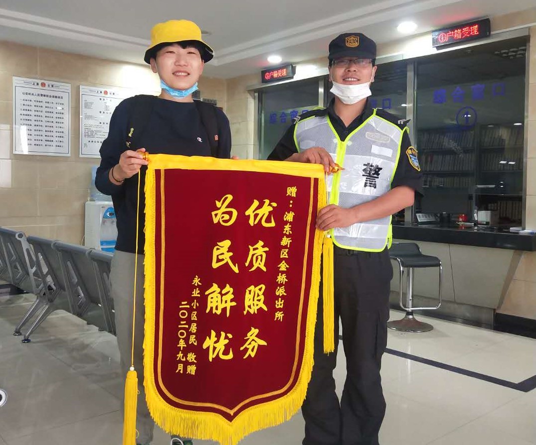 9月18日,永业小区一居民拿着一面绣着“优质服务,为民解忧”大字的锦旗走进派出所,感谢公司驻金桥派出所辅警项目的薛兴旺、孙智明、董腾飞等3名队员。