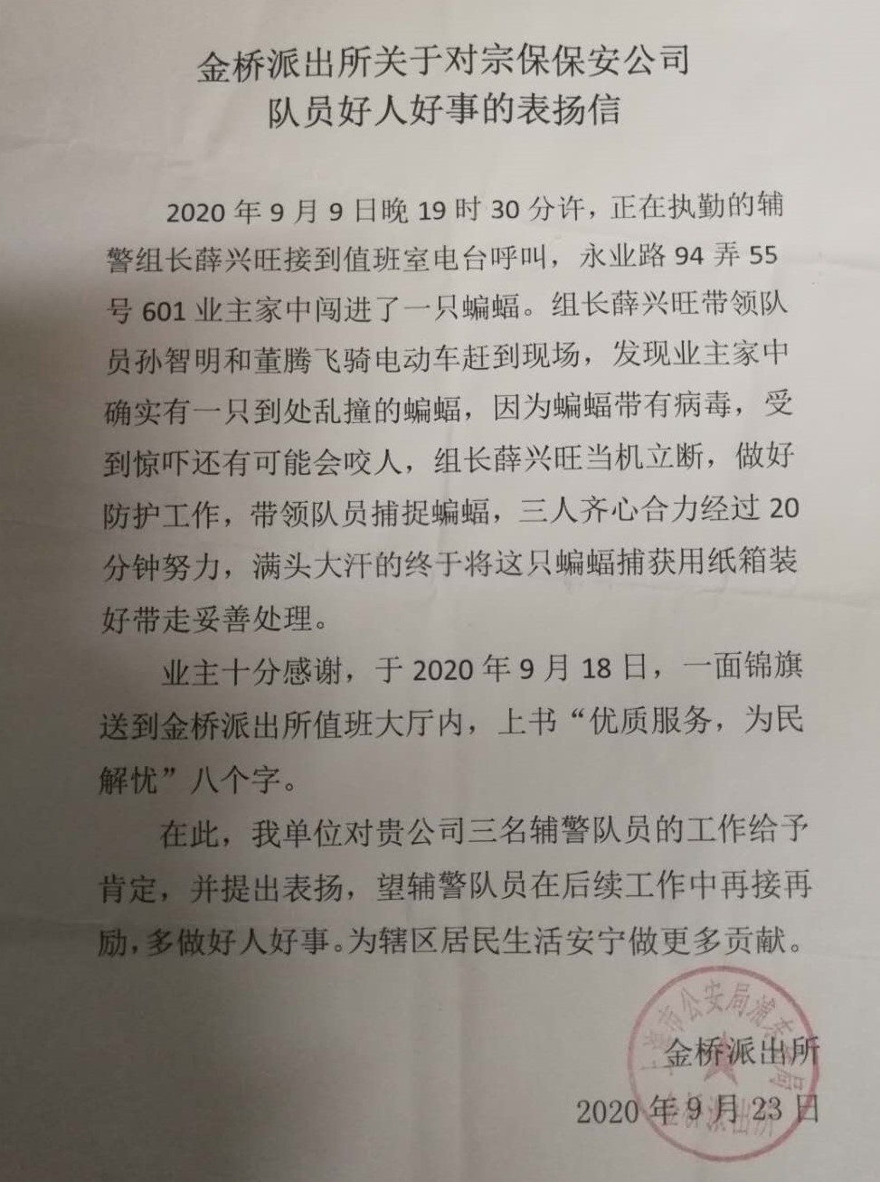 组长薛兴旺在警讯群中反馈蝙蝠的处置情况后,值班领导,对他们的行为点赞,表示高度的认可。派出所领导了解事情经过后,专门写了一封表扬信进行书面表扬。