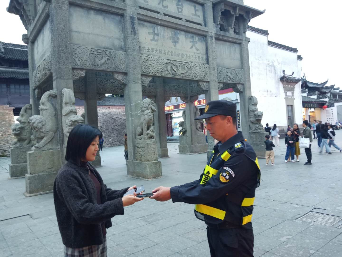 10月5日,宗保公司驻黄山市歙县项目队员吴超捡到一部手机归还失主。 当日,歙县项目队员吴超在古城景区巡逻时发现一部遗落在地面的手机,捡起后发现手机设置屏锁,无法联系失主,便立刻向项目负责人报告,并在原地等待。 约20分钟后,一名女子急急忙忙赶过来寻找手机。经过信息核对,确认是手机主人后,队员将物品归还给失主。看到失而复得的手机,失主喜出望外,连声向值勤队员致谢。 供稿人:都松林