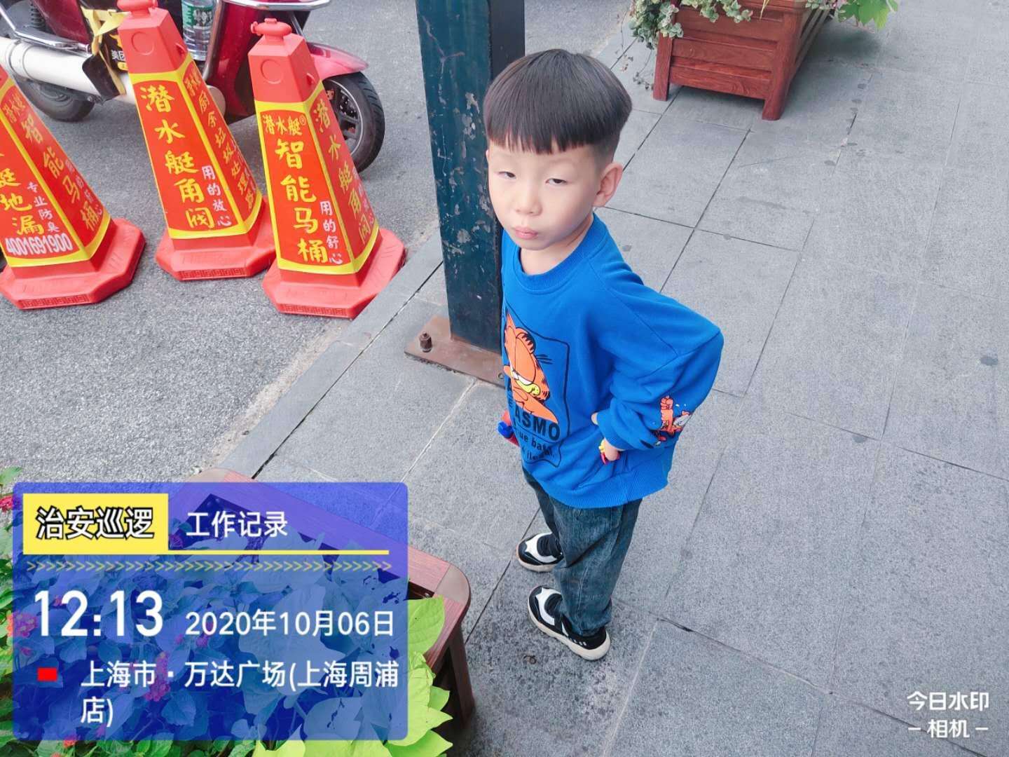 当日12:00,辅警耿茂张在周康路万达停车场出口附近值勤时,发现一个男童独自一人行走,队员见状随即上前询问,得知小朋友和妈妈走散了,而且他也不知道妈妈的手机号码。