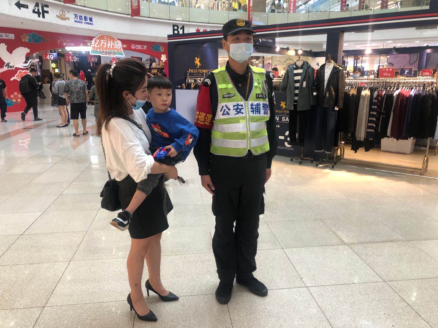 队员立即将情况报告组长,并将小朋友带往万达服务台。12:19,在服务台碰到正在寻找孩子的妈妈,原来两人从美食街东侧进万达D门,孩子妈妈只顾着玩手机,抬头一看发现孩子已经不在身边了。确认好身份后,队员将孩子交给妈妈,并提醒她要注意看护好孩子以免发生意外,孩子妈妈非常感谢辅警的帮助。