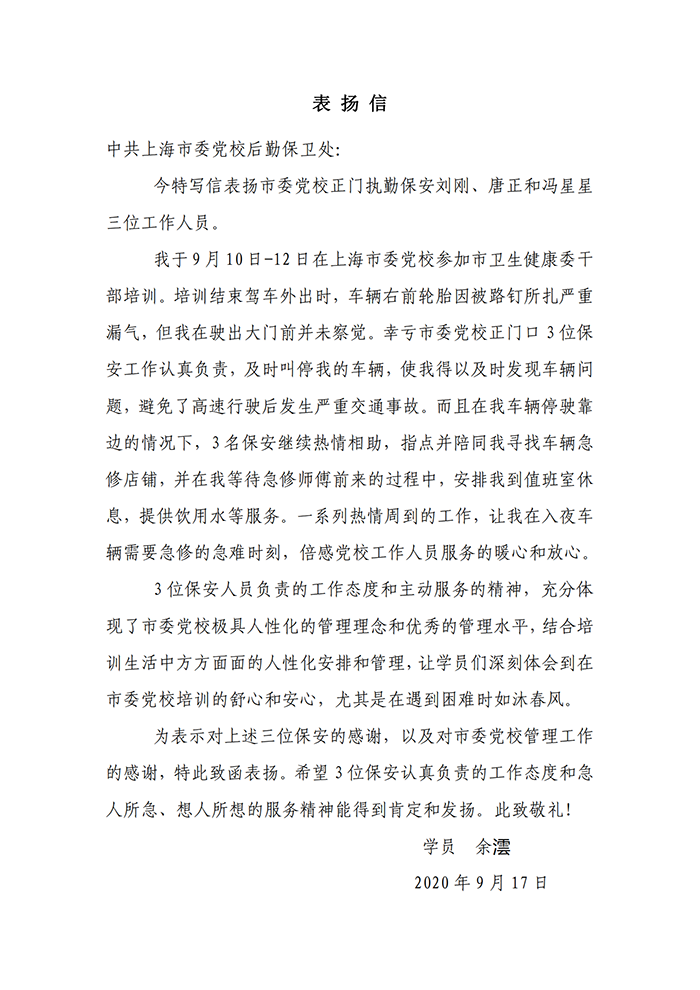 为表示对刘刚、唐正、冯星星三位宗保保安的感谢,学员余澐特送来感谢信,希望三位保安认真负责的工作态度和急人所急、想人所想的服务精神能得到肯定和发扬。