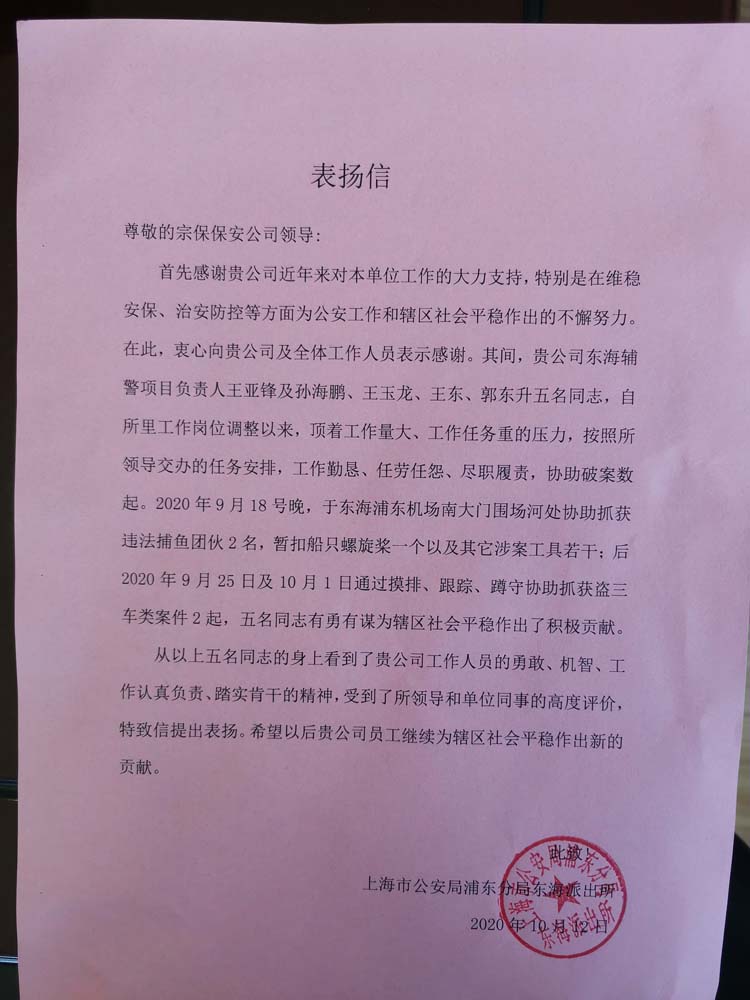 10月12日,上海宗保保安服务有限公司收到东海派出所送来的表扬信,信中对惠祝区域东海辅警项目队员王亚峰、孙海鹏、王玉龙、王东、郭东升五名同志任劳任怨、尽职尽责的工作态度给予了充分肯定和赞扬。