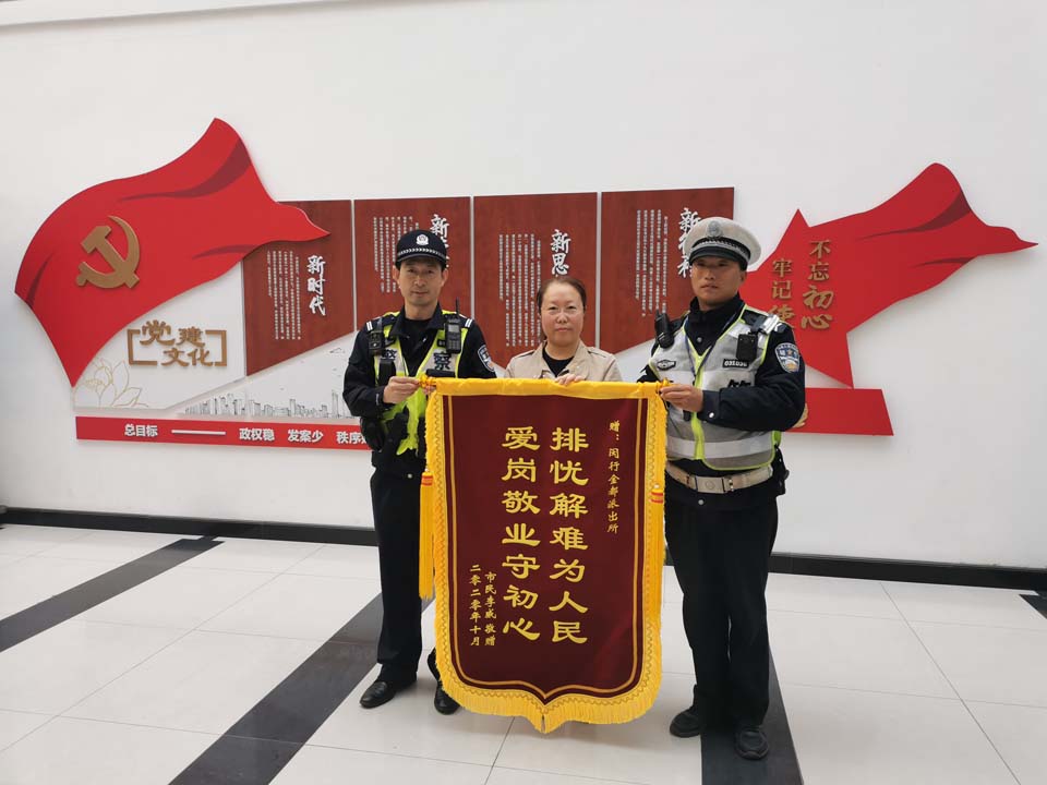 11月6日,市民李威女士来到闵行金都派出所,将一封感谢信和一面绣有“爱岗敬业守初心 排忧解难为人民”的锦旗送到民警马秀军和宗保驻闵行莘庄工业区项目队员乔骏的手中,对两位的热心帮助表达诚挚的感谢。