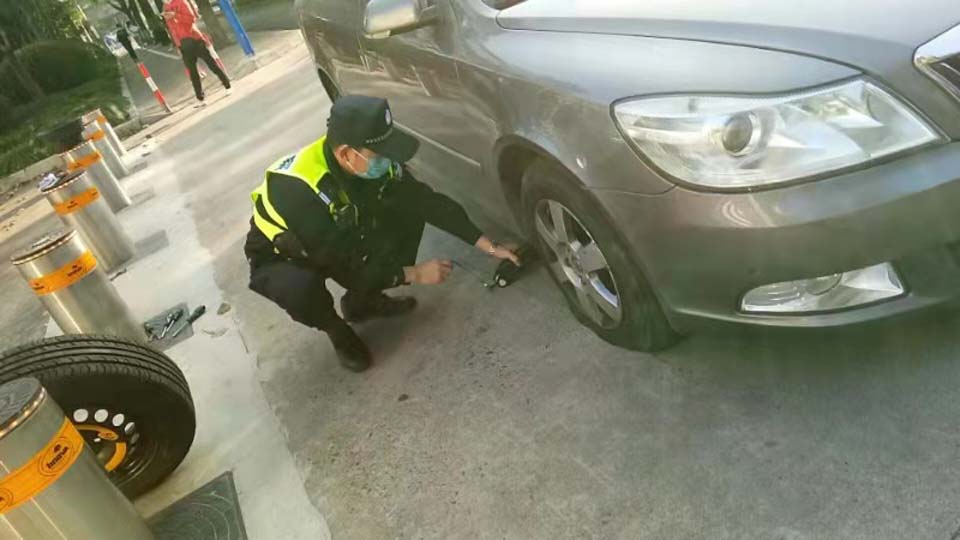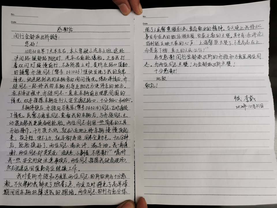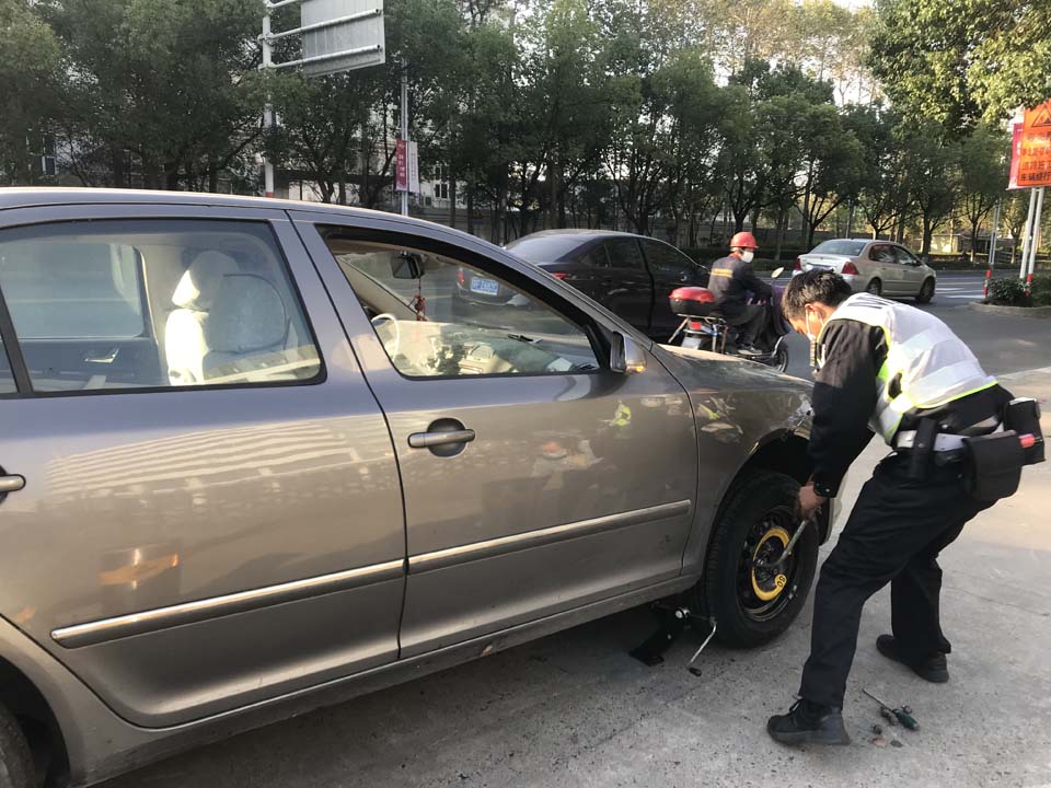 10月30日7:30,李女士驾驶小型汽车行驶至沪闵银都路口时,车辆右前轮突然爆胎,在路中间打着双闪缓慢行驶。路口当值民警马秀军和辅警乔骏发现后,立即上前询问,了解情况后及时将车辆引导至不影响交通的分局南大门处。