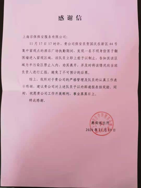 11月19日,浦东新区公安分局惠南派出所副所长殷昌建将一封感谢信送到公司驻惠南区域队员贺国庆手中,对其及时制止一名男子企图进入隔离区的行为提出表扬。