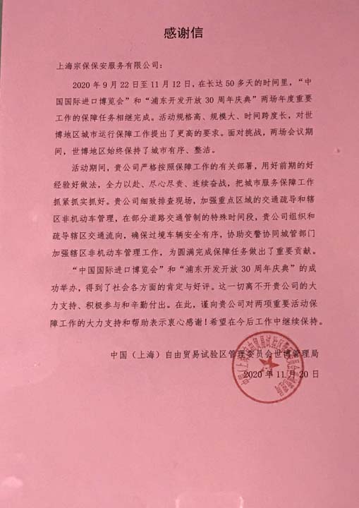 12月8日,自由贸易试验区管理委员会世博管理局将一面绣有“精神饱满 精益求精”的锦旗和一封感谢信送到宗保公司副总经理王耀的手中,对公司在“中国国际进口博览会”和“浦东开发开放30周年庆典”活动提供的有力保障和帮助表达诚挚的感谢。