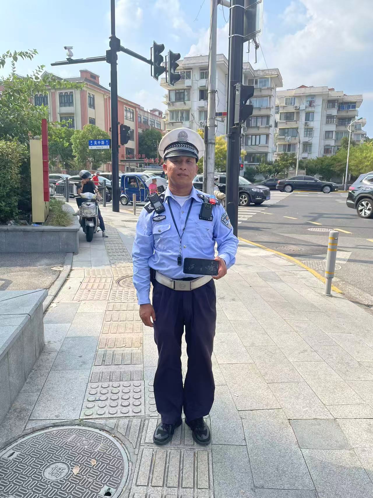 9月6日15:00,宗保公司驻闵行区虹桥交管辅助项目员工丁雄狮在吴中路虹许路路口执勤时,捡到一部VIVO手机。询问路人无果后,便将情况报告了带班组长,并按指示在原地边执勤边等待失主。(供稿人:白四强)