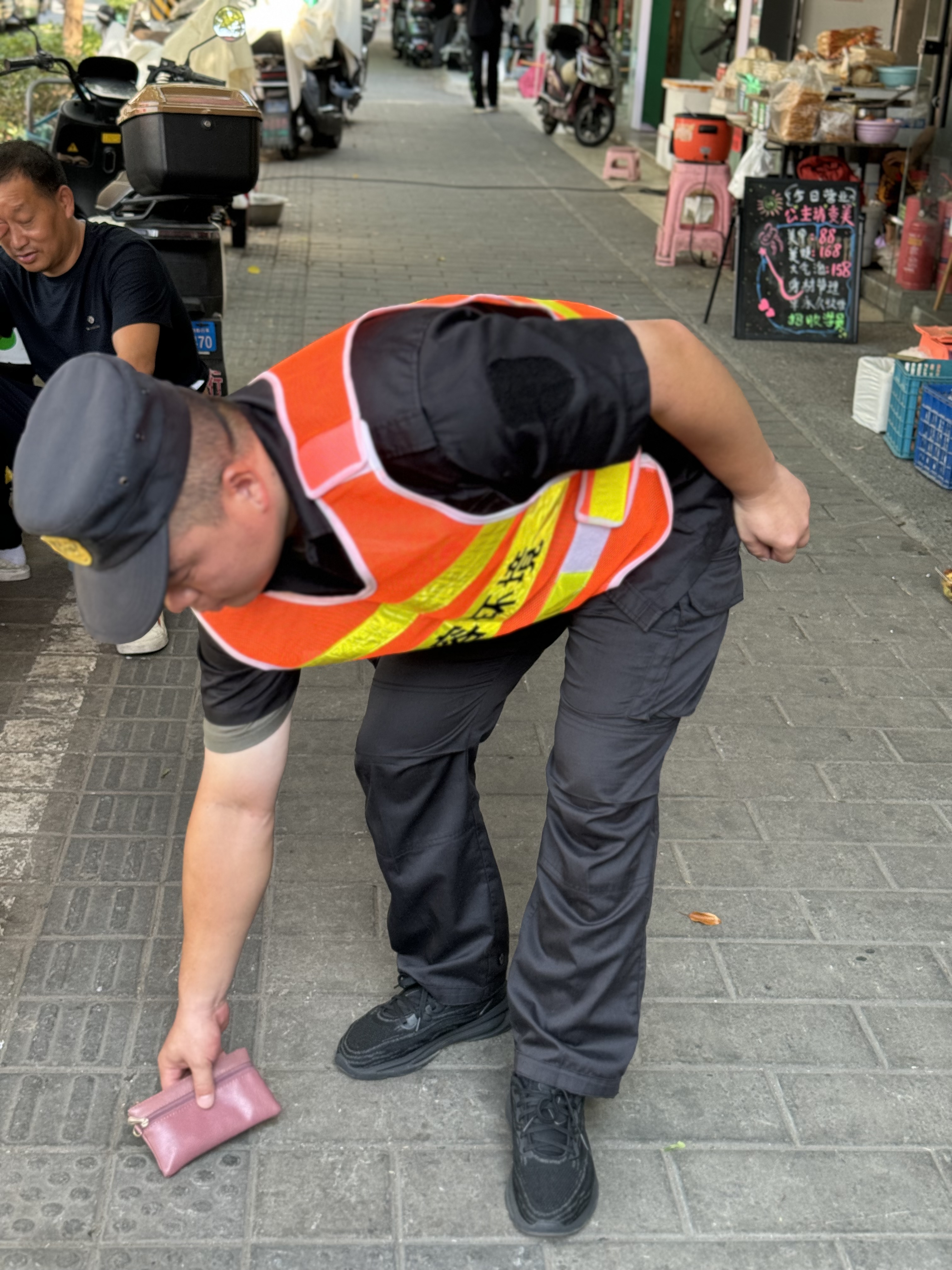 9月9日10:40,宗保公司驻浦东新区南码头市容项目员工桑飞巡逻至浦三路675号时,捡到一个粉色手包,内有500元现金、身份证、银行卡、社保卡等物品。考虑到失主可能会返回寻找,桑飞将情况报告项目负责人后便在原地等待。
