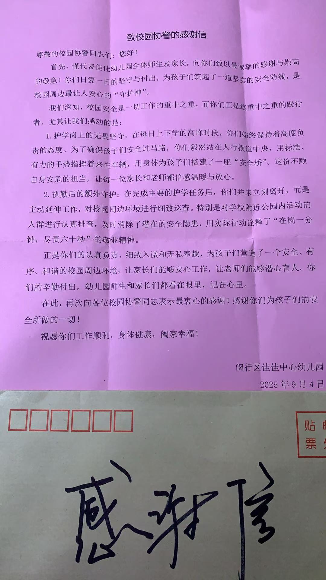 中心幼儿园感谢公司员工们在护校期间尽职尽责、任劳任怨的辛勤付出,赞扬员工们圆满完成护校任务,主动提供暖心护航,所展现出的良好职业素养和服务意识。