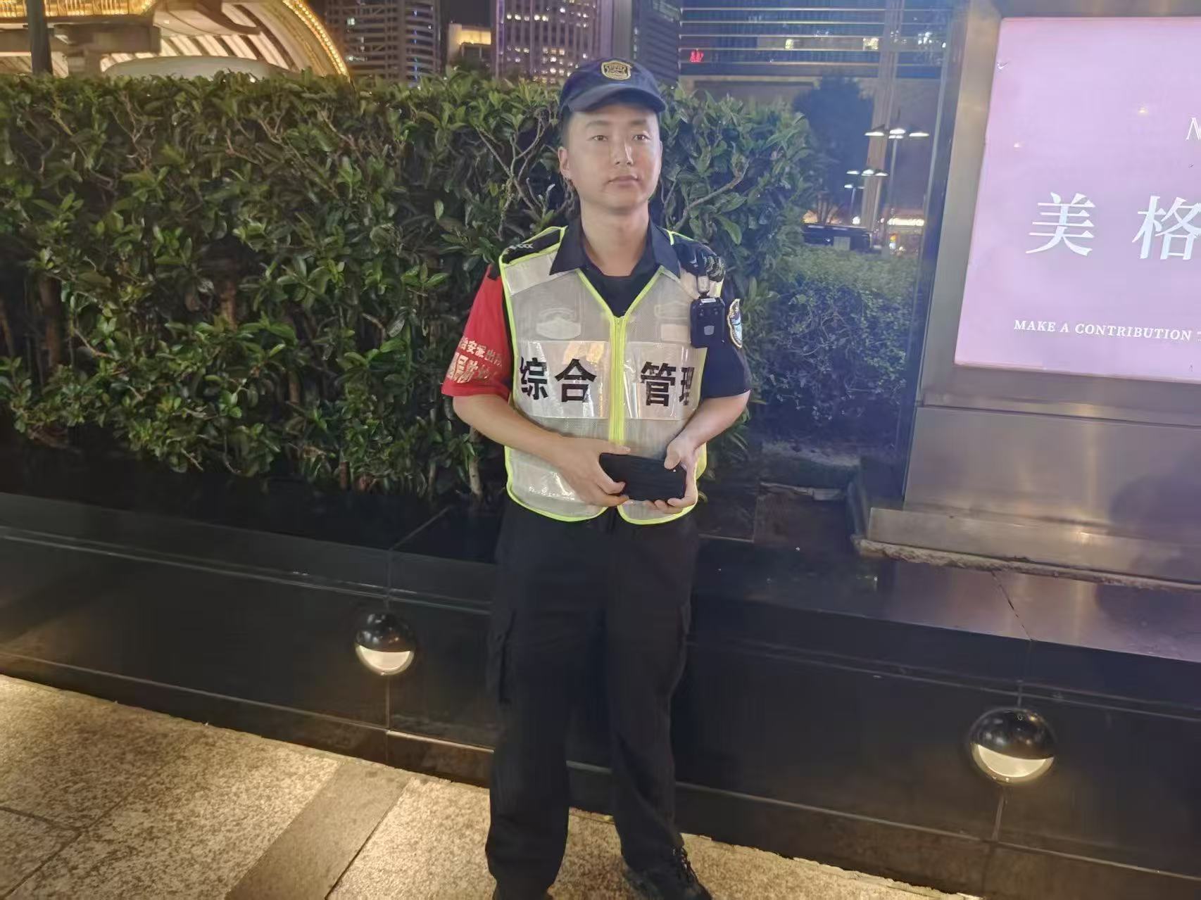 9月27日22:05,宗保公司驻浦东新区陆家嘴综合管理项目员工王泽星在金茂大厦2号门附近执勤时,捡到一个黑色挎包,内有一部苹果手机、一副耳机和一个钱包。王泽星随即将情况报告了班组长,并按指示在原地等待。