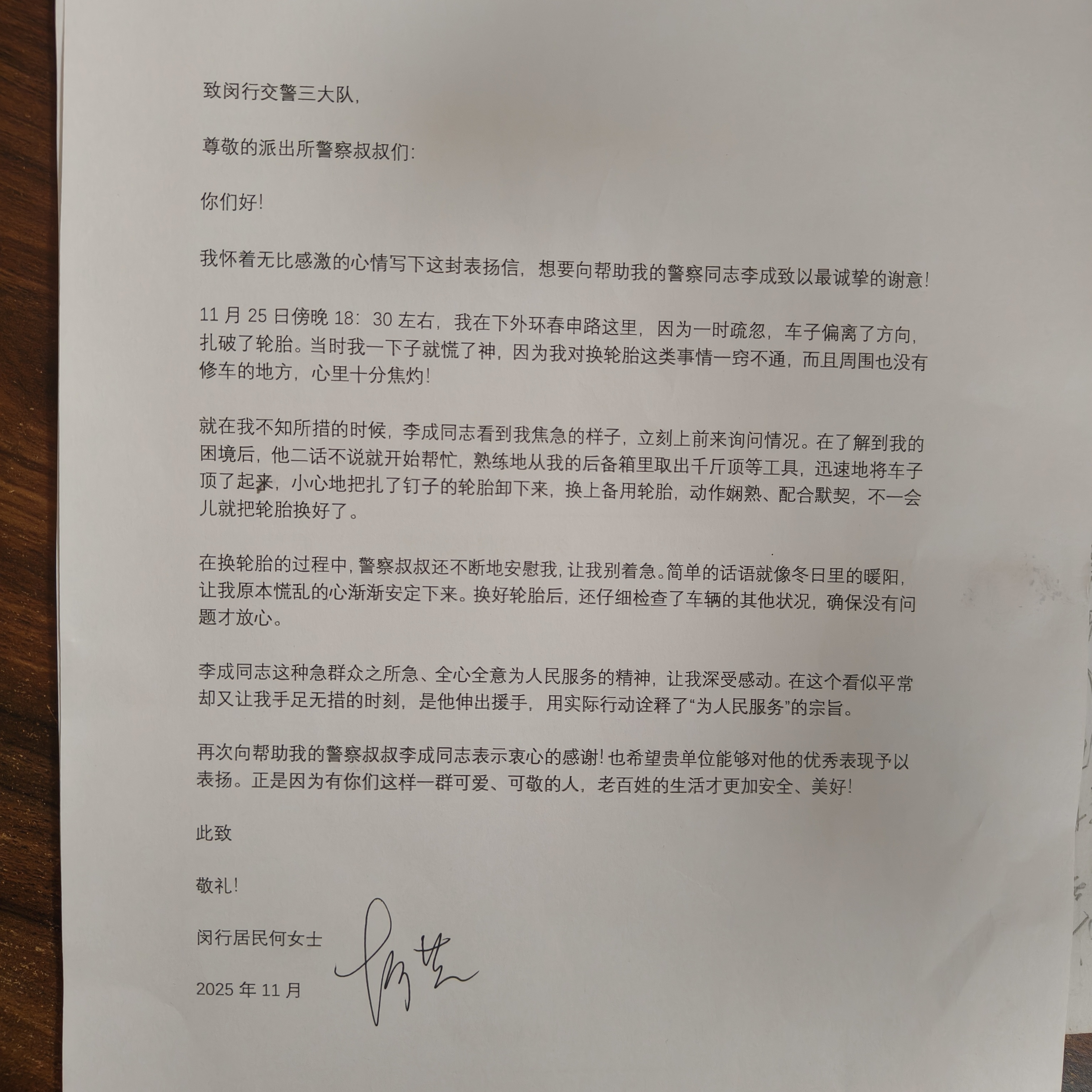 轮胎更换完毕后,李成又仔细检查了车辆轮胎气压及其他关键部位,确认车辆无安全隐患后,才放心让何女士驾车离开。事后,何女士为表示感谢,特意送来一面锦旗表达谢意。