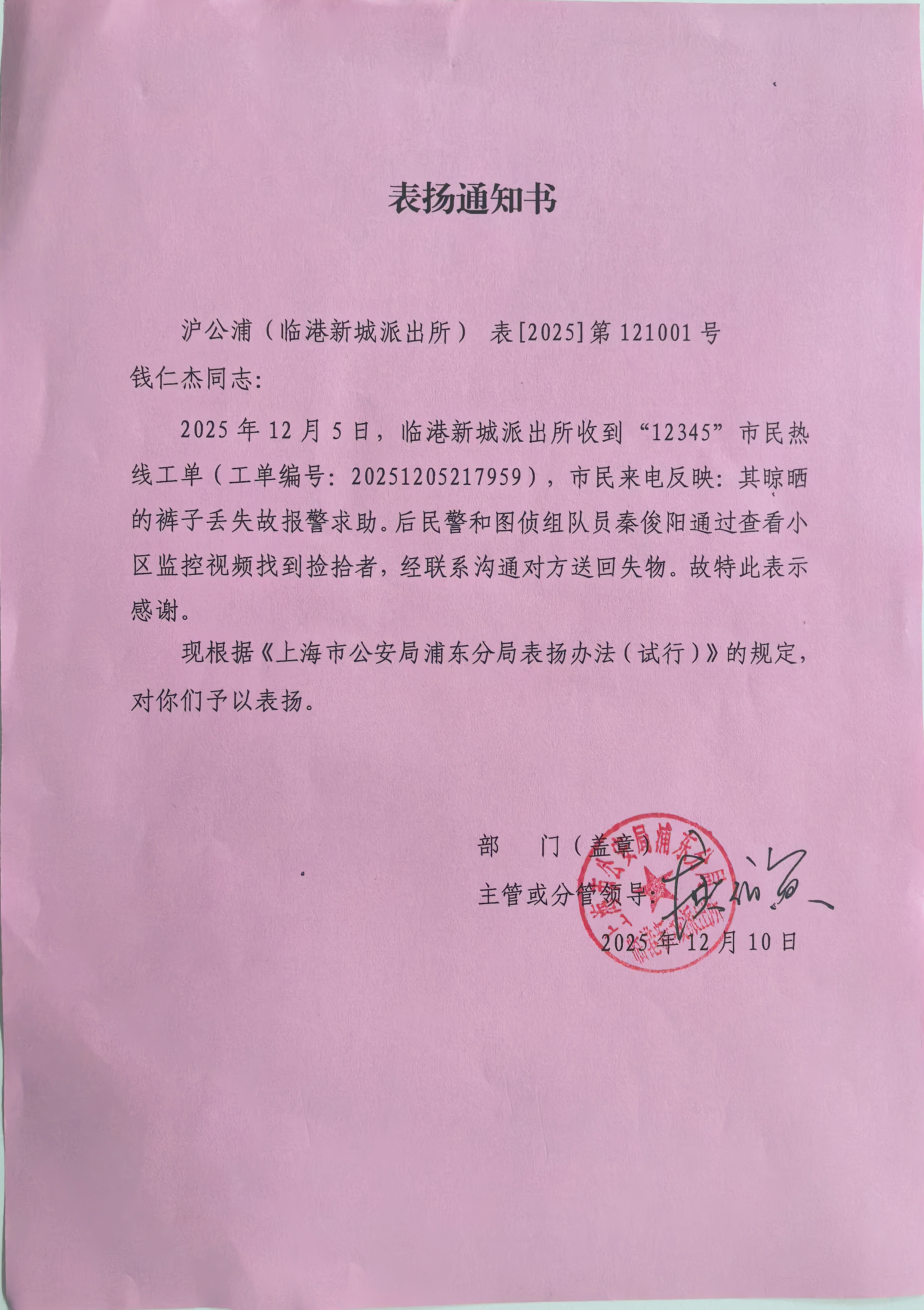 12月10日,宗保公司驻浦东新区临港新城派出所辅助项目收到临港新城派出所的表扬通知书,信中对员工秦俊阳耐心细致、敬业尽责查看小区监控视频,帮助报警人成功找回失物的出色表现予以表扬。 (供稿人:鲁学圆)