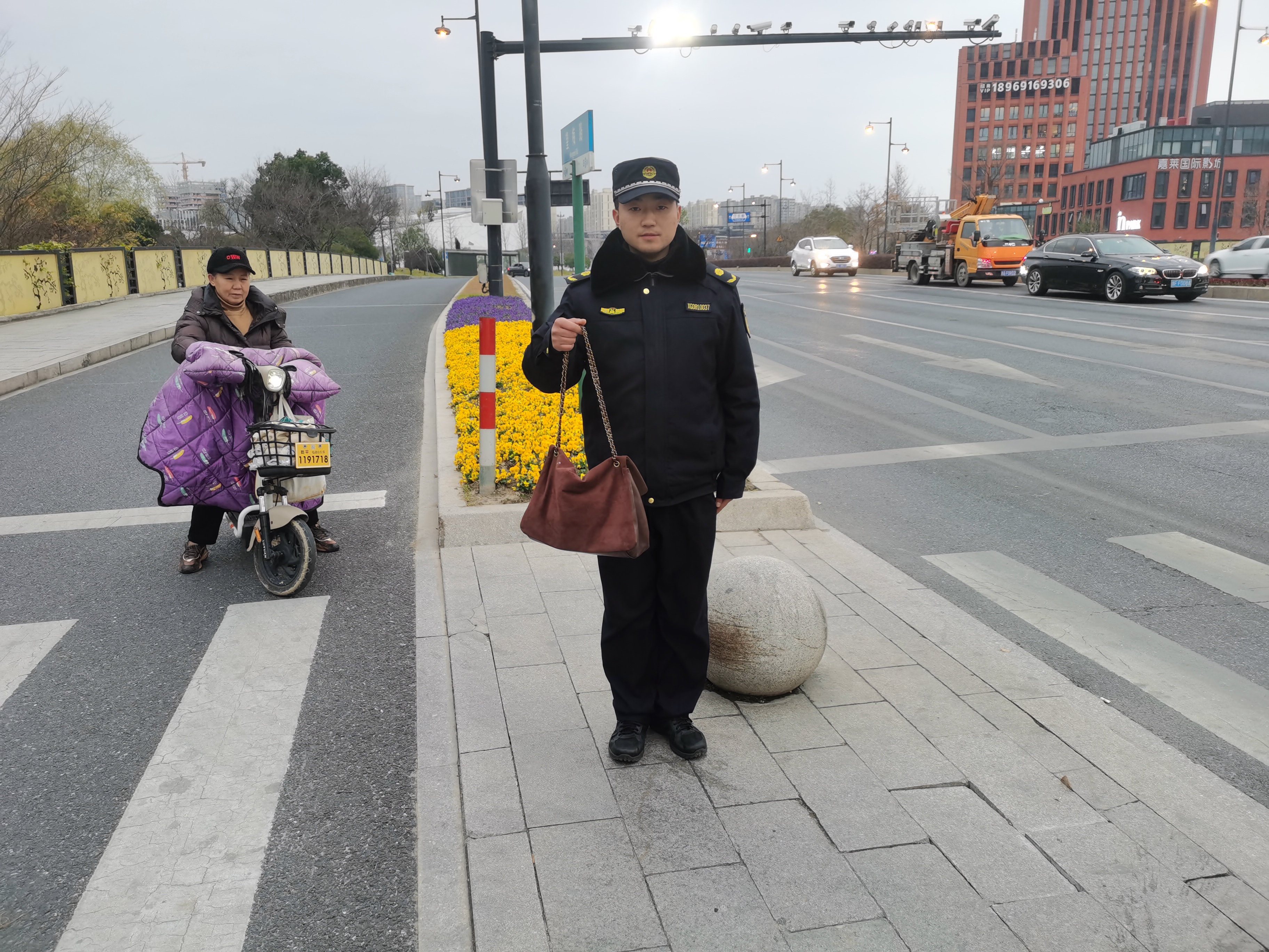 12月31日16:43,浙江民泰公司驻杭州市临平区新城市容项目员工余炎峰在望梅路新丰路路口巡查时,捡到一个手提包,随即将情况报告了带班负责人,并按指示在原地边巡查边等待失主。