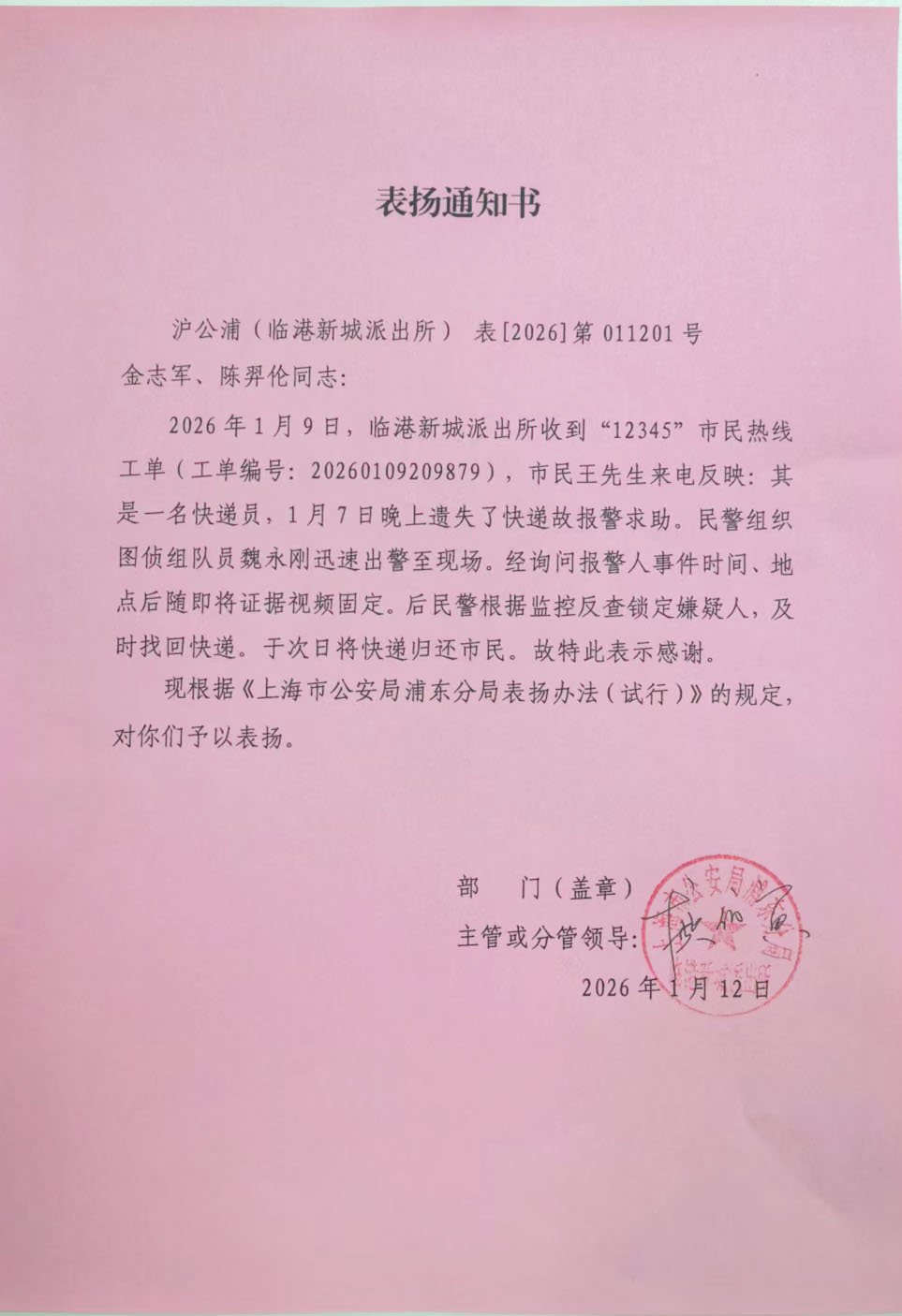 1月12日,宗保公司驻浦东新区临港新城派出所辅助项目收到临港新城派出所的表扬通知书,对公司员工魏永刚耐心细致地梳理线索、排查信息,最终帮助市民王先生成功找回丢失包裹的敬业精神予以表扬。