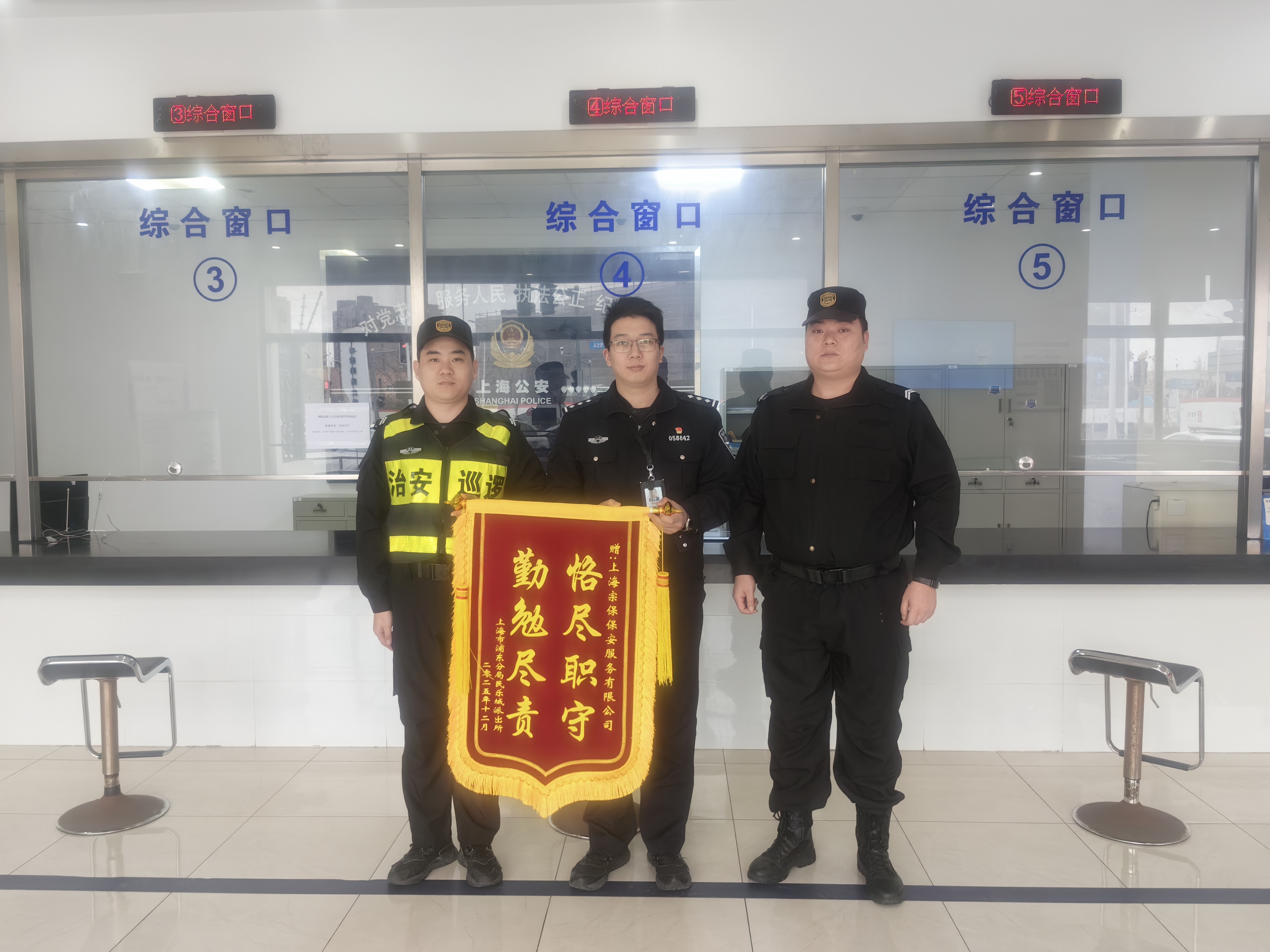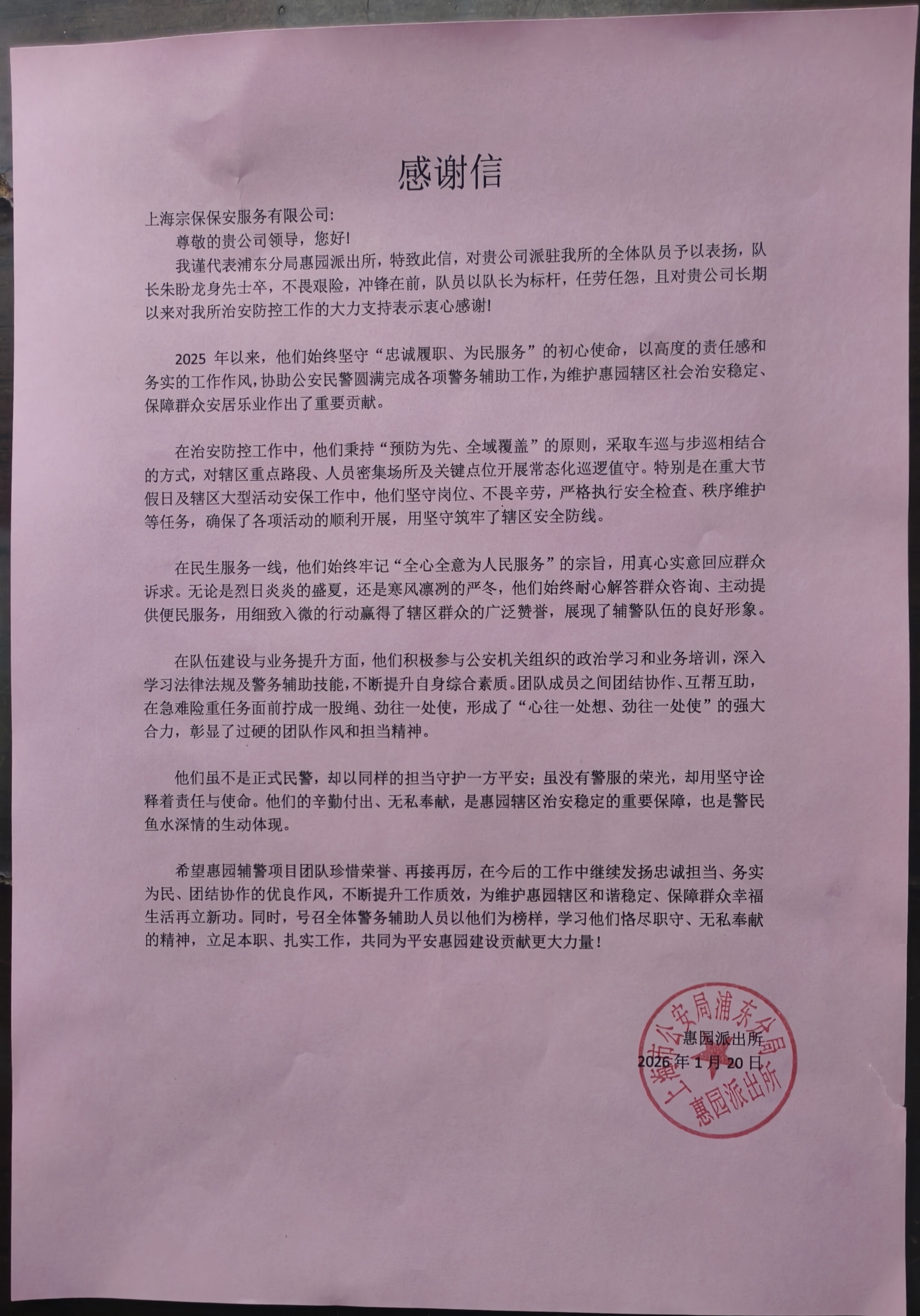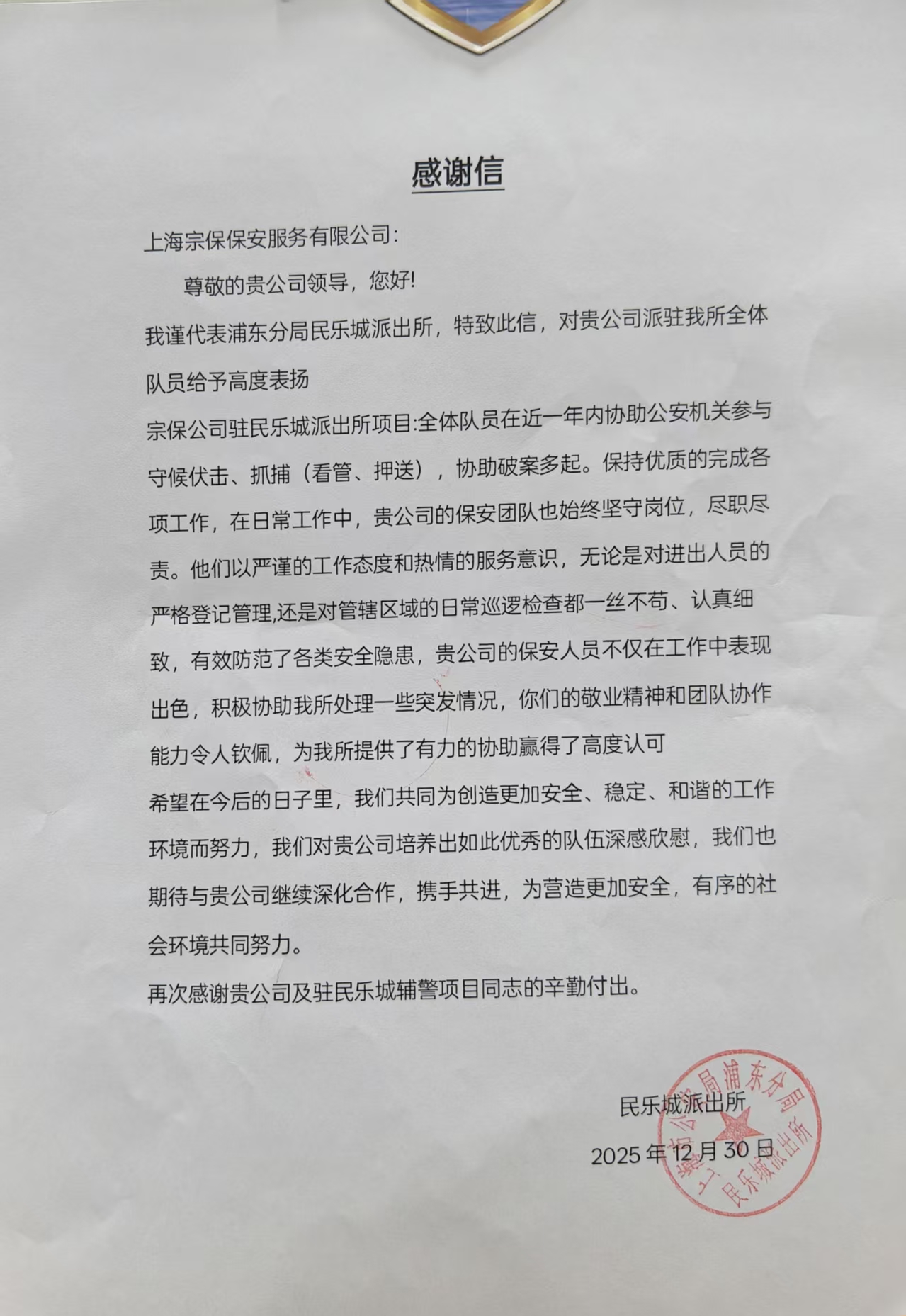 1月22日,宗保公司驻上海市浦东新区惠南派出所辅助项目收到惠南派出所赠送的一面绣有“作风优良 能打胜仗”的锦旗和一份表扬通知书,通知书感谢公司对派出所工作的大力支持,表扬公司员工严守工作纪律、积极主动作为,在全力协助派出所完成秩序维护、安全巡查、应急处突等任务中所展现的优良素质。