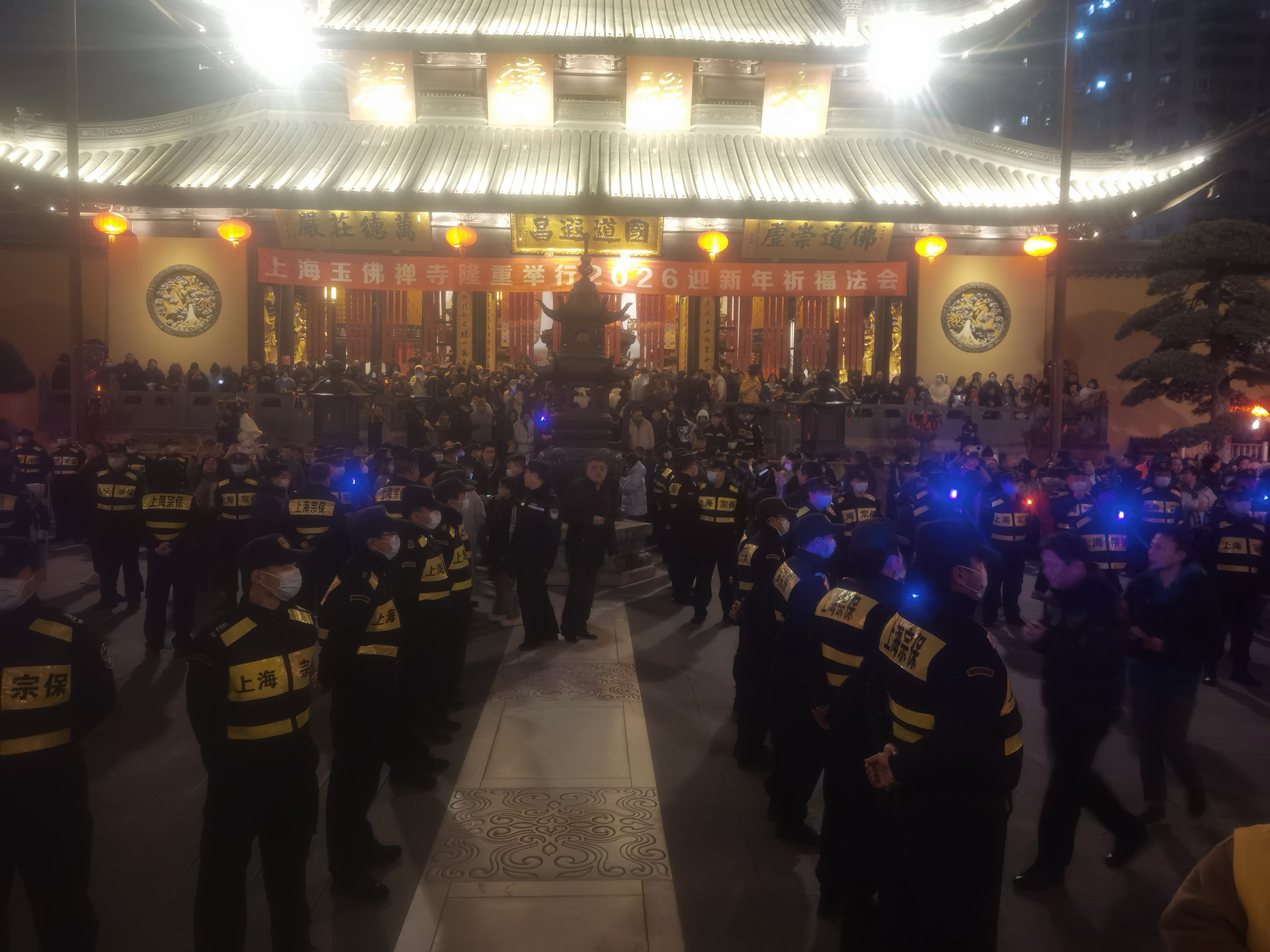 岁末钟声近,祈福迎新春。2025年12月31日跨年夜,玉佛寺与东海观音寺迎来了一年一度的跨年祈福活动,众多市民游客纷至沓来,祈愿平安,迎接新年。为保障活动安全有序进行,宗保公司在公安机关和活动主办方的统筹指导下,精心组织、周密部署,助力圆满完成了此次跨年夜安保任务,为市民游客营造了安心、舒心的祈福环境。