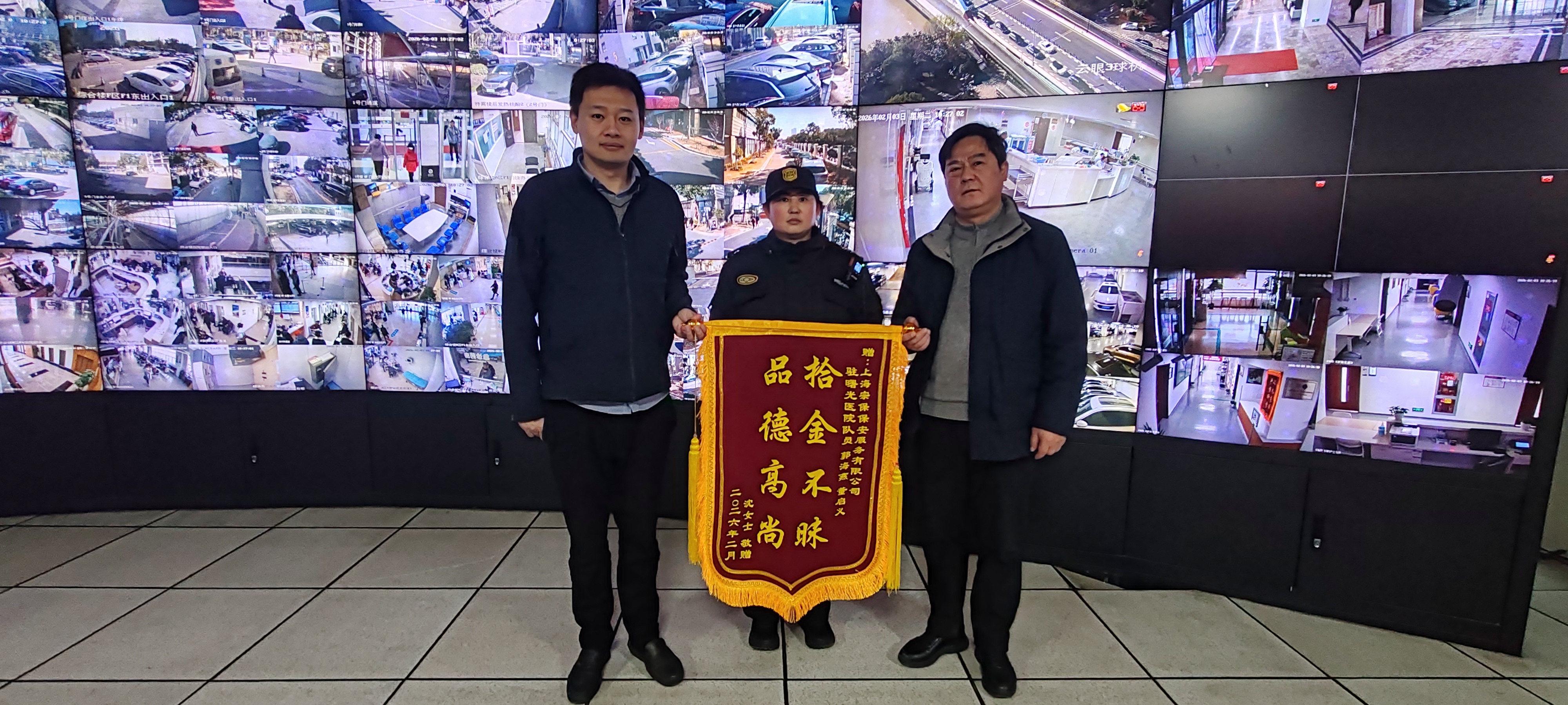 2月2日,宗保公司驻浦东新区曙光医院东院项目收到市民沈女士赠送的一面绣有“拾金不昧 品德高尚”锦旗,感谢公司员工董启义和郭海燕拾金不昧及时归还贵重物品的助人行为。