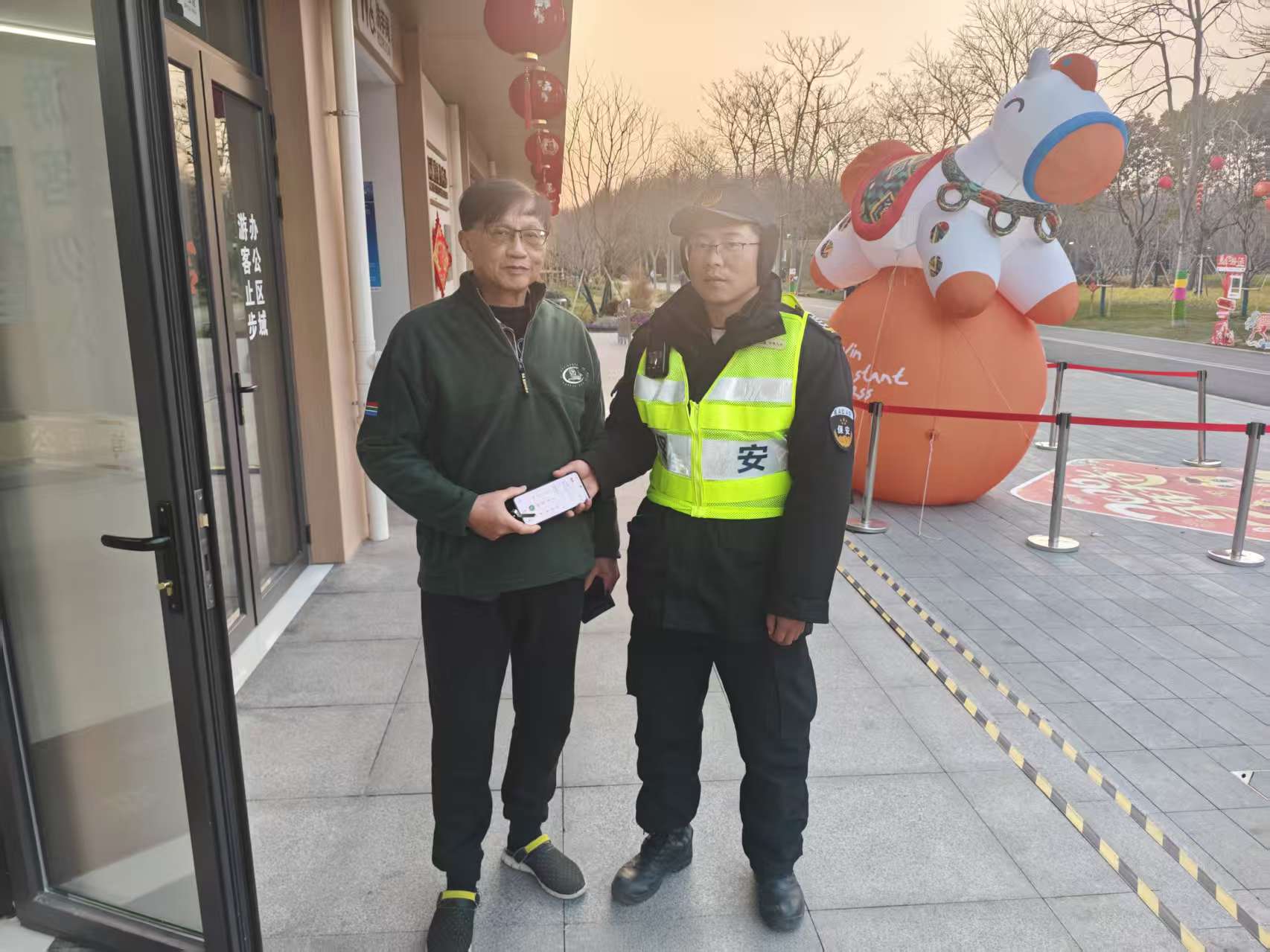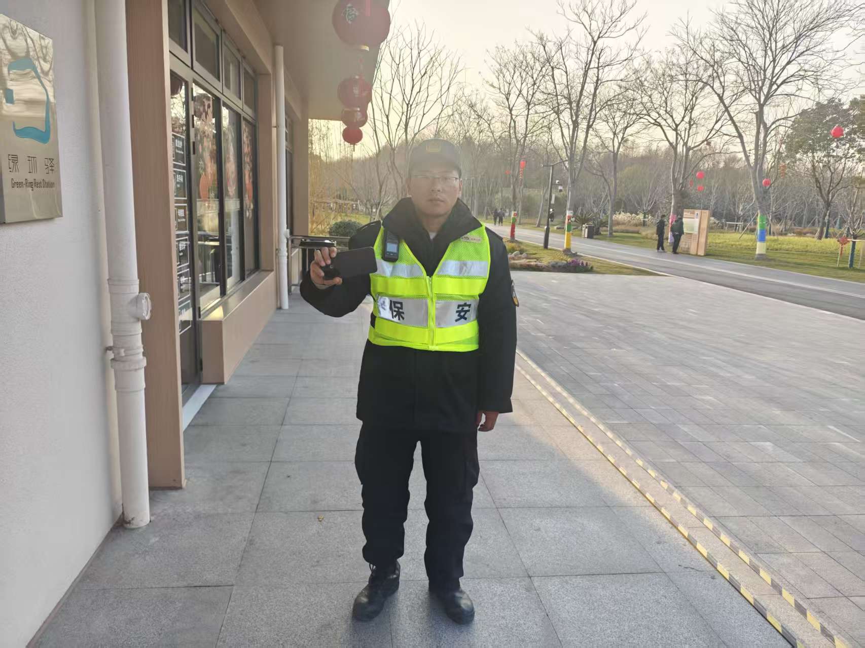 2月22日15:30,宗保公司驻浦东新区康桥横沔公园项目员工吴振远在儿童乐园附近巡逻时,捡到一部华为手机,报告带班组长后,便在原地边巡逻边等待。