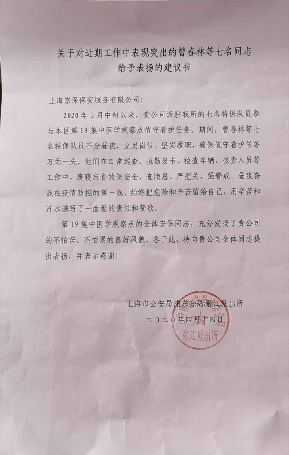 4月14日,宗保公司驻张江派出所辅警项目收到张江出所送来的一封表扬信,信中对该项目参与第19集中医学观察点值守看护任务的曾春林等宗保队员提出表扬和感谢。