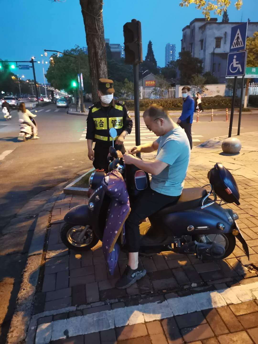 小耿在路边仔细注意过往的人群,看是否有失主前来寻找。不一会一名男子骑着电瓶车慌慌张张地赶过来,边走边询问路人有没有看到一个包。耿俊杰上前跟他进行核实,确定男子是失主。经核对包内东西无误后,耿俊杰将书包归还给了失主。